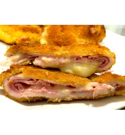 Cotolette di prosciutto cotto e formaggio, ingredienti: prosciutto cotto, Edamer, uovo, pane grattugiato. Pronte per essere cotte al forno o fritte in padella.