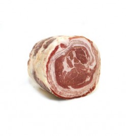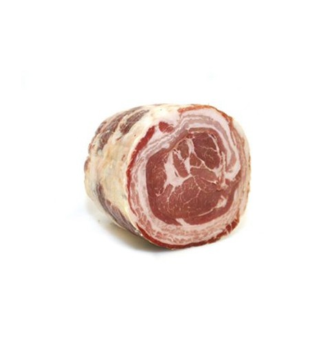 Pancetta sgrassata, senza cotenna, arrotolata con l'aggiunta (al centro) di coppa di suino. Un prodotto magro e appetitoso.